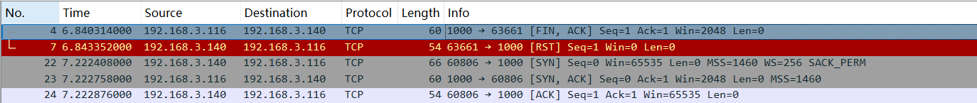 (1)写disconnect命令断开,拔掉网线再插上后,芯片发出FIN包,调试工具返回RST释放连接,芯片收到RST后进入断开中断。断开中断中重新开启socket和开启监听,客户端重新发起连接即可。