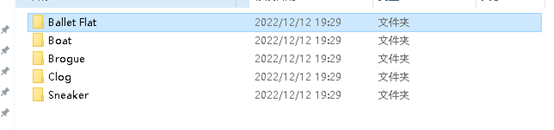 从Kaggle上下载数据集,解压打开,分别是芭蕾舞鞋、船鞋、布洛克鞋、木屐、运动鞋。