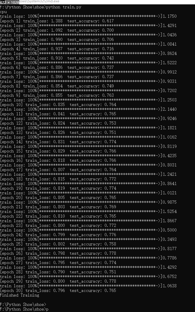 通过实现训练30次的效果我们可以知道,模型的准确率在75%左右