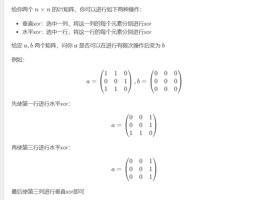 这是个下午刚做的题目 这是一个矩阵异或 我想了半天怎么做就是没想到去把两个矩阵异或掉 然后你会发现异或得到的矩阵就是我们操作的矩阵 而这个矩阵初始是全部是0是我们通过很多步骤让他变成我们是二者相等的矩阵
