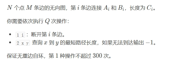 所以我们只需要把删除边的剩下边 跑一次最短路 然后再倒着做 把边不断增加不断对他进行取min就好了 这样xy需要for循环枚举