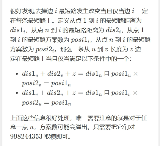 if(dis[a[i].y]==dis[u]+a[i].z)posi[a[i].y]=(posi[a[i].y]+posi[u])%mod;//距离相等则方案数累加