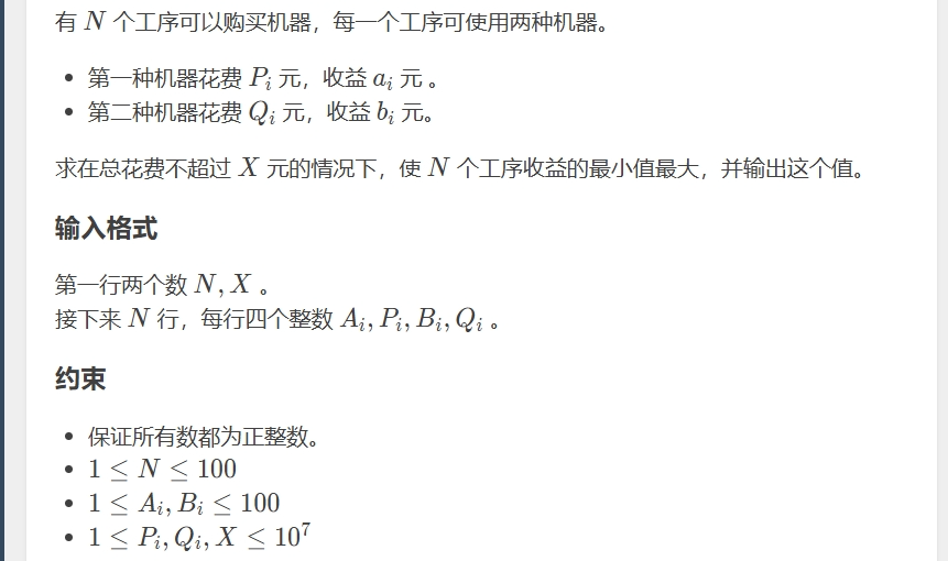 首先做这道题要有一个性价比的思想 我们肯定优先使用性价比高的机器 为什么呢 注意到数据范围 ai bi 都是小于100的