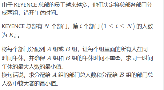 这道题 题目都没读懂 看的题解才看懂了 很明显 不是sum/2这种 因为不是人数可以随便分配
