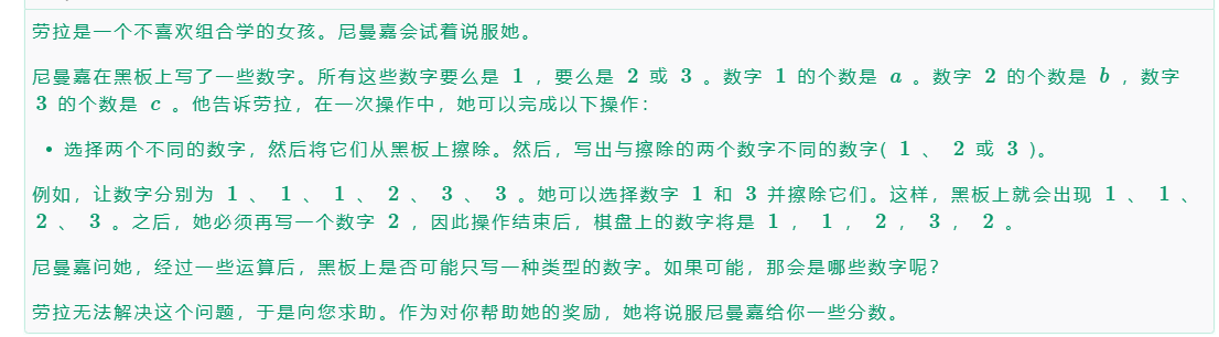 你就会发现如果数量之和是偶数那么肯定可以只留下a一个球 所以此题就ok了