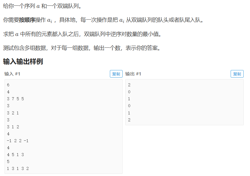 是一个贪心的思路,对于一个数在入队列时候,放前还是后是一个问题,这个时候我们就要知道队内有多少个元素小于它大于它,然后决定前后顺序,于是我们可以想到把它放进集合里,然后二分查找出来,不过由于是迭代器,不是真实的地址,使用 \(distance\) 函数对于stl是Olen的 数组没必要用这个 所以这边考虑使用orderset 就行了