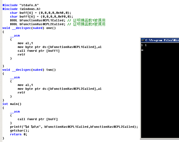 BOOL bFunctionHas0CPL1Called; // 证明裸函数1被调用