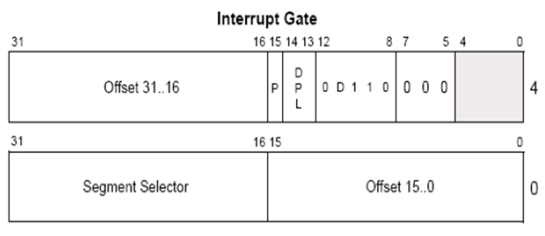 P = 1 S = 0 TYPE = 1110 为 32位中断门描述符(D位=0为16位 D位=1为32位)