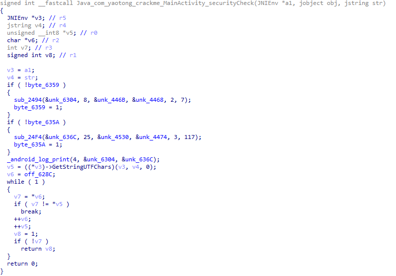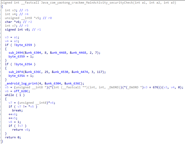 9.程序崩掉了 应该是有反调试了 我们来静态分析看看Java_com_yaotong_crackme_MainActivity_securityCheck这个函数