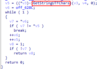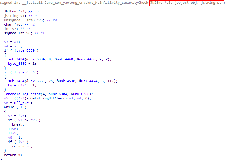 首先看到它的最后 要么返回1 要么返回 0 再根据Java层定义的那个native方法为bool类型 估计大概密钥就在这块了