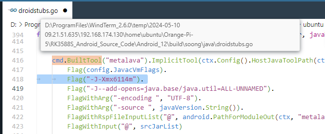 编辑 build/soong/java/droidstubs.go 文件,在 Flag(config.JavacVmFlags). 后换行追加 Flag("-J-Xmx6114m"). :