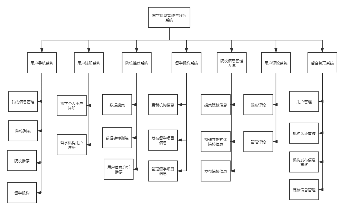 学信息管理与分析系统是一个留学生或希望寻找留学的个人和留学机构的多边平台,留学生或者希望留学的个人可以通过本平台寻找自己感兴趣的留学信息或者搜索感兴趣的学校信息(申请条件,GPA要求,申请通过率等等),通过输入学生相关信息获得系统的推荐院校,以及可以通过平台联系感兴趣的留学机构。同时,留学机构也可以通过该平台发布相关信息吸引留学生报名本机构。