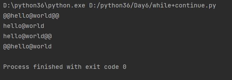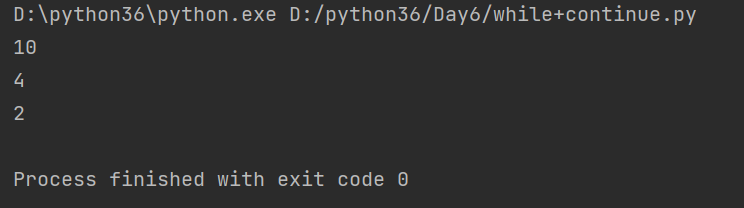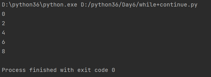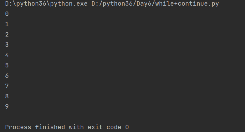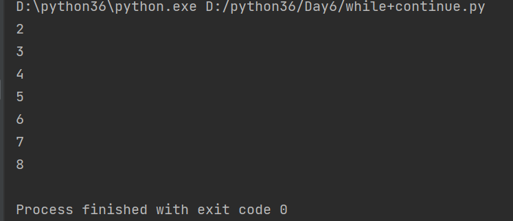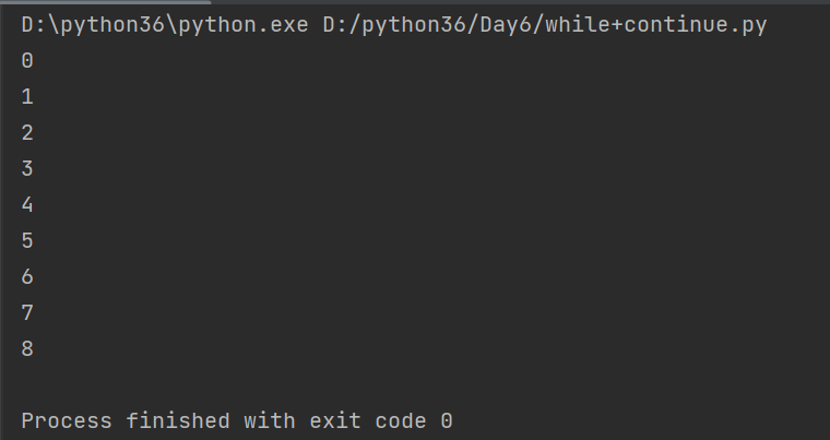 1 count = 0 2 while count < 9: 3 if count == 5: 4 count += 1 5 continue # 跳出本次循环 6 print(count) 7 count += 1