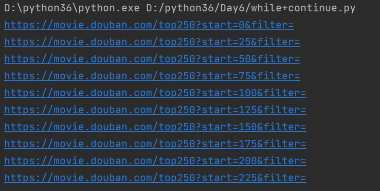 base_url = 'https://movie.douban.com/top250?start=%s&filter=' for i in range(0, 250, 25): print(base_url % i)