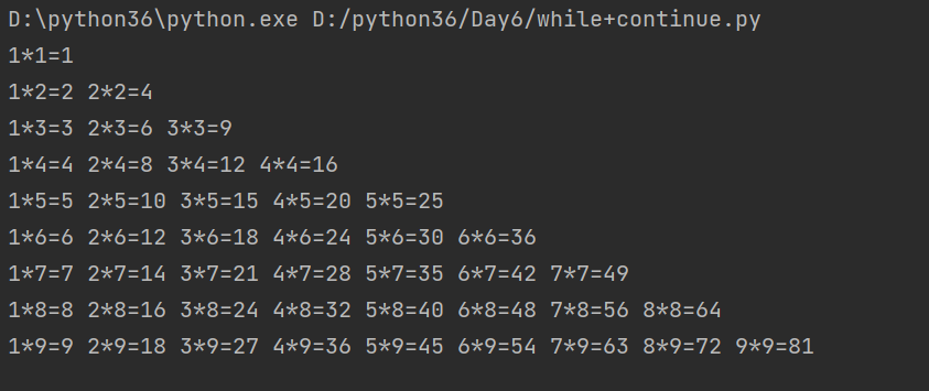 for i in range(1, 10): for j in range(1, i + 1): print('%s*%s=%s' % (j,i,j*i), end=' ')