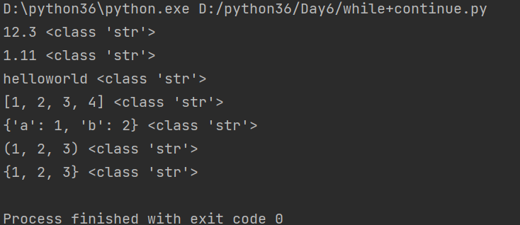 res = 12.3 print(str(res), type(str(res))) print(str(1.11), type(str(1.11))) print(str('helloworld'), type(str('helloworld'))) print(str([1, 2, 3, 4]), type(str([1, 2, 3, 4]))) print(str({'a': 1, 'b': 2}), type(str({'a': 1, 'b': 2}))) print(str((1, 2, 3)), type(str({'a': 1, 'b': 2}))) print(str(({1, 2, 3})), type(str({'a': 1, 'b': 2})))