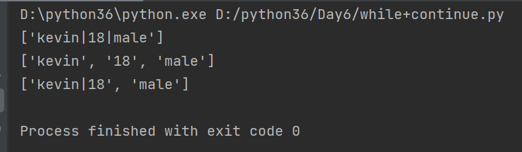 l = 'helloworld' l = 'kevin 18 123' l = 'kevin|18|male' print(l.split()) # ['kevin', '18', '123'] 默认是空格切分,切分之后是列表的形式 print(l.split('|')) # ['kevin', '18', 'male'] 默认是空格切分,切分之后是列表的形式 print(l.rsplit('|', maxsplit=1)) # 从右边开始切分,且只切分一次