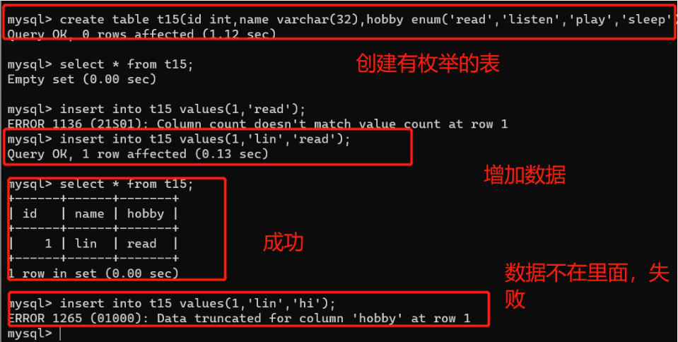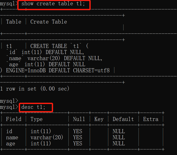 create table emp( id int primary key auto_increment, name varchar(20) not null, sex enum('male','female') not null default 'male', #大部分是男的 age smallint(3) unsigned not null default 28, hire_date date not null, post varchar(50), post_comment varchar(100), salary double(15,2), office int, #一个部门一个屋子 depart_id int );