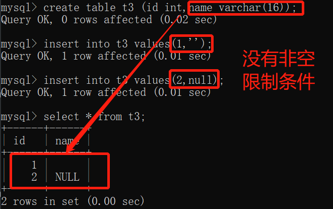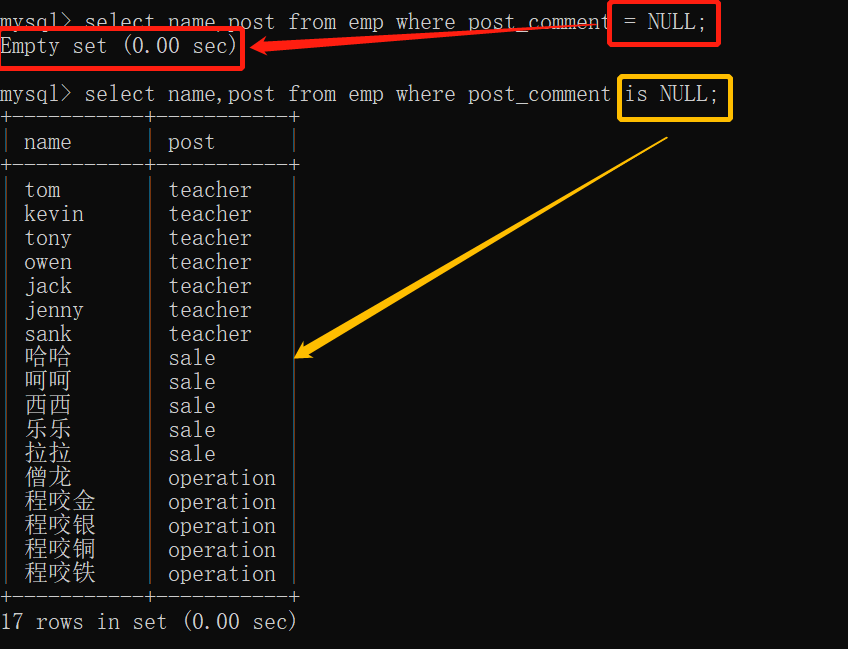 select name,post from emp where post_comment = NULL; # 查询结果为空! select name,post from emp where post_comment is NULL;