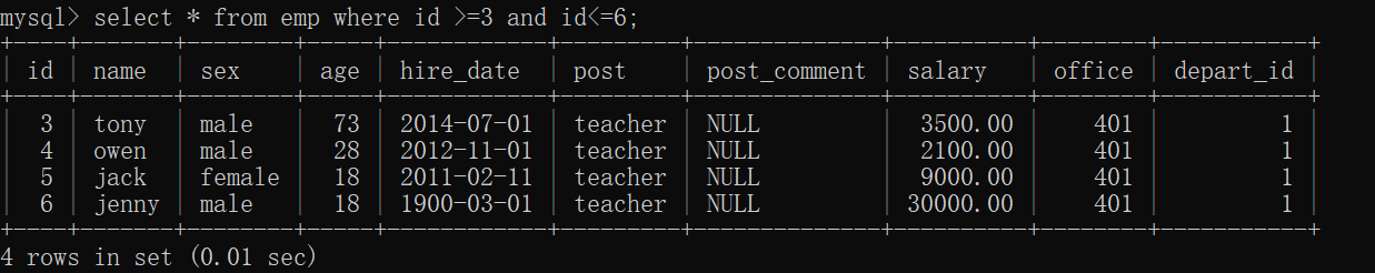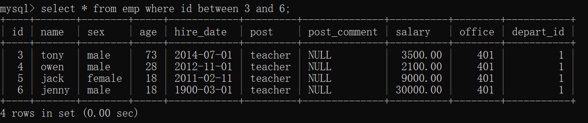 # 方式1: select * from emp where id <3 or id >6; #方式2: select * from emp where id not between 3 and 6;