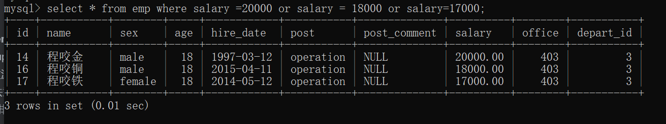 # 方式1 select * from emp where salary =20000 or salary = 18000 or salary=17000;