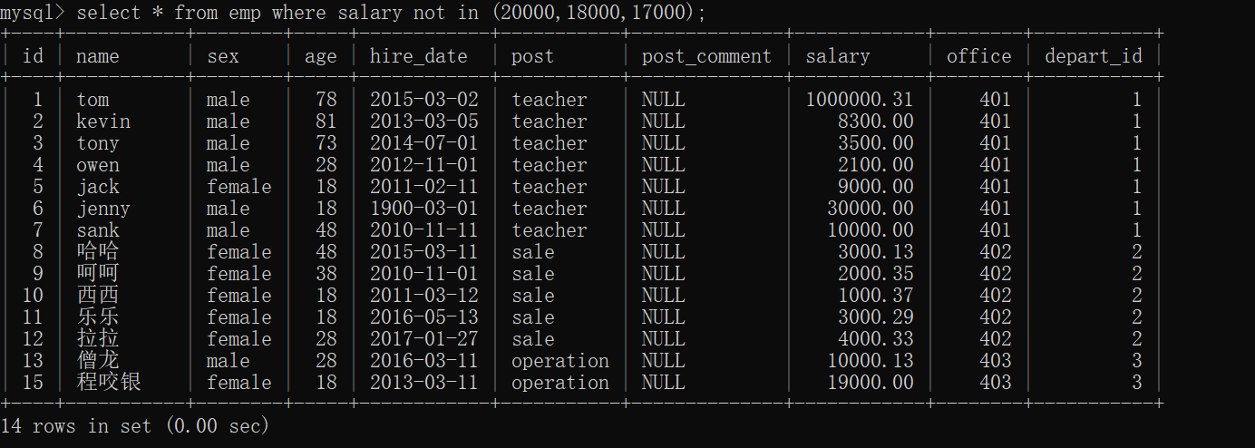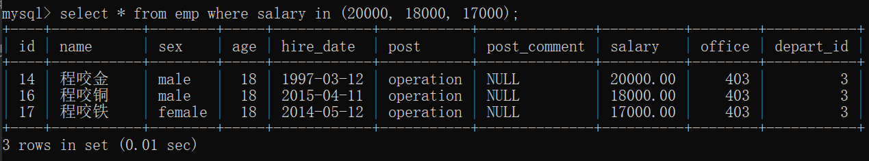 # 方式2 select * from emp where salary in (20000, 18000, 17000);