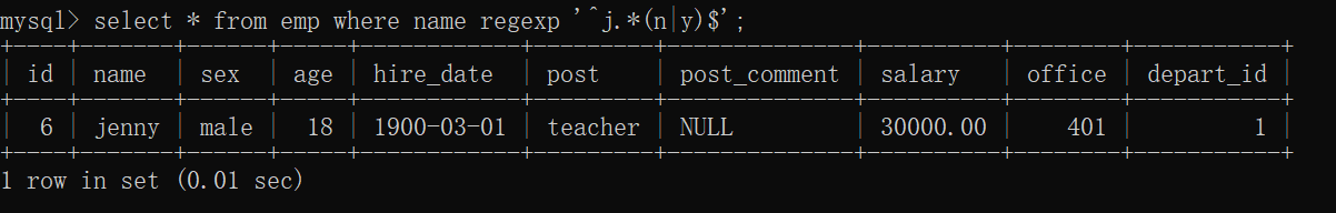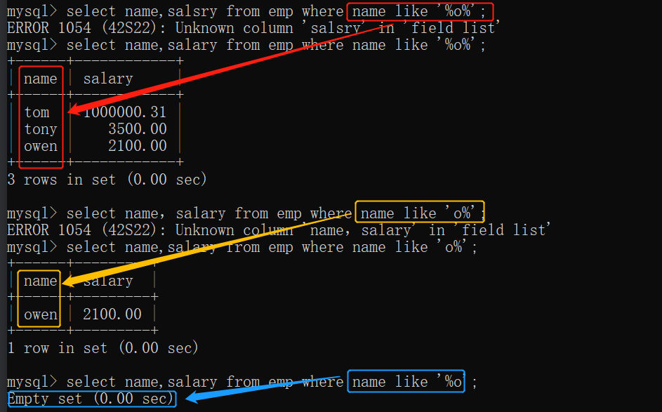 select name,salary from emp where name like '%o%'; #补充1,以o开头的: select name,salary from emp where name like 'o%'; #补充2,以o结尾的: select name,salary from emp where name like '%o';