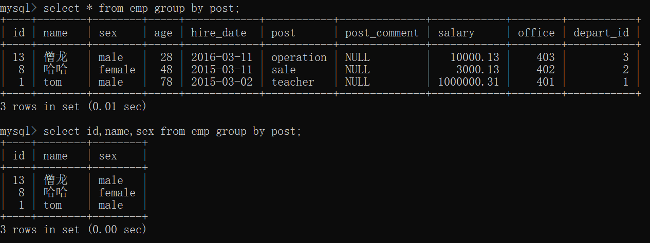 select * from emp group by post; # 进行验证: select id,name,sex from emp group by post;