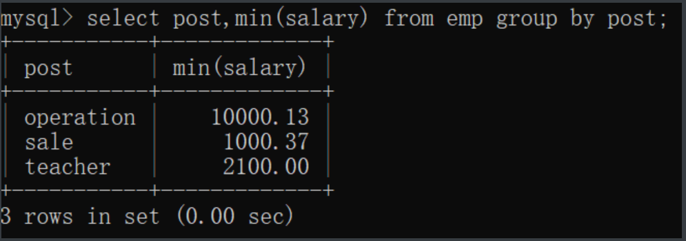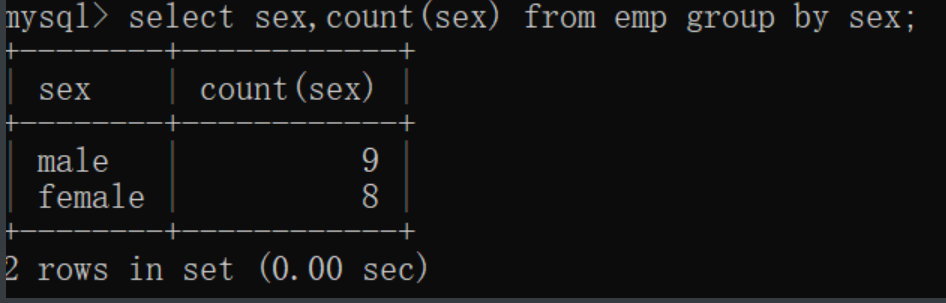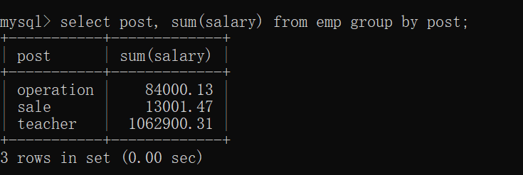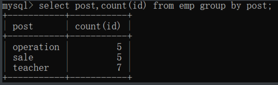 select post, count(*) from emp group by post; select post, count(id) from emp group by post; select post, count(1) from emp group by post; # 第一列的count