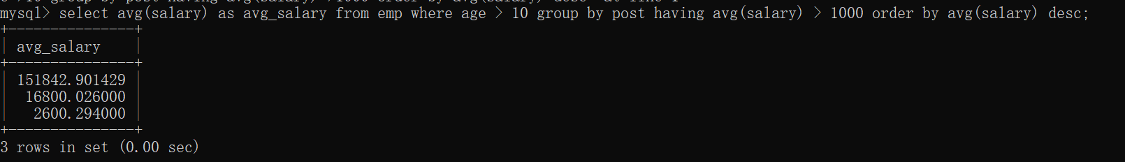 # 1.先筛选出年龄在十岁以上的员工 select * from emp where age >10 # 2.按部门分组,求平均工资 select avg(salary) as avg_salary from emp where age >10 group by post # 3. 筛选出平均工资大于1000的部门 select avg(salary) as avg_salary from emp where age >10 group by post having avg(salary) >1000 # 4. 对平均薪资进行排序 select avg(salary) as avg_salary from emp where age > 10 group by post having avg(salary) > 1000 order by avg(salary) desc;