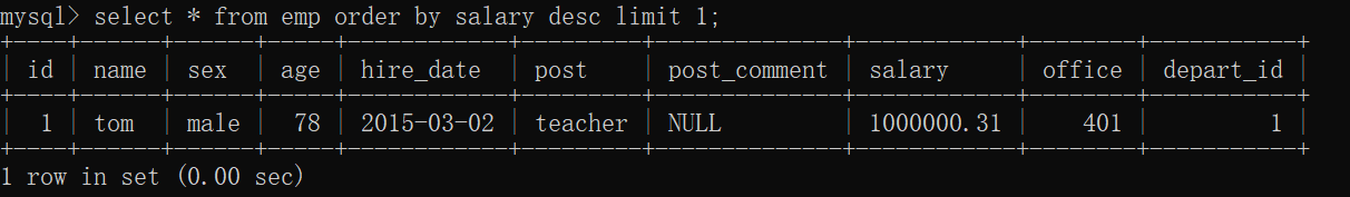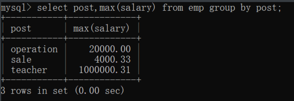 select post as '部门',max(salary) as '最高工资' from emp group by post;