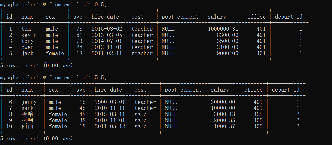 select * from emp limit 0,5; # 第一个参数表示起始位置,第二个参数表示的是条数,不是索引位置 select * from emp limit 5,5; # 第一个参数代表的是起始位置,第二个参数是限制 的条数