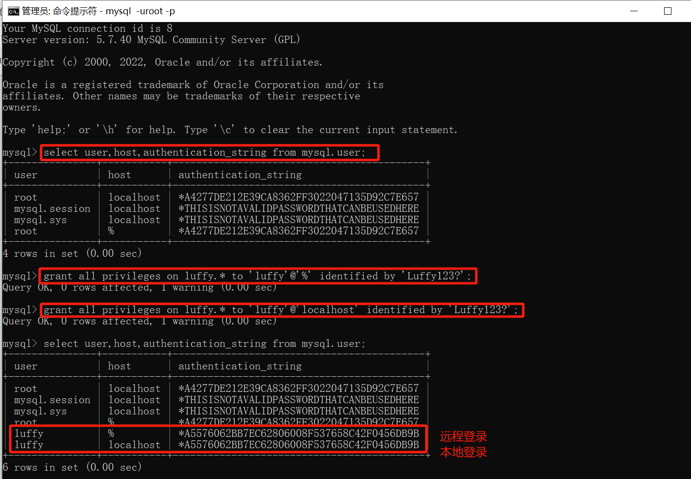 grant all privileges on luffy.* to 'luffy'@'%' identified by 'Luffy123?'; (*号代表所有表,%:远程登录)