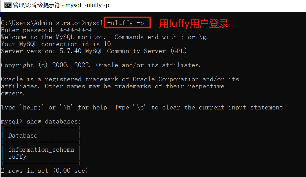 3. 以后,操作luffy库,都用luffy用户登录,就不用root用户了