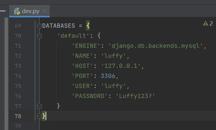 DATABASES = { 'default': { 'ENGINE': 'django.db.backends.mysql', 'NAME': 'luffy', 'HOST': '127.0.0.1', 'PORT': 3306, 'USER': 'luffy', 'PASSWORD': 'Luffy123?' } }