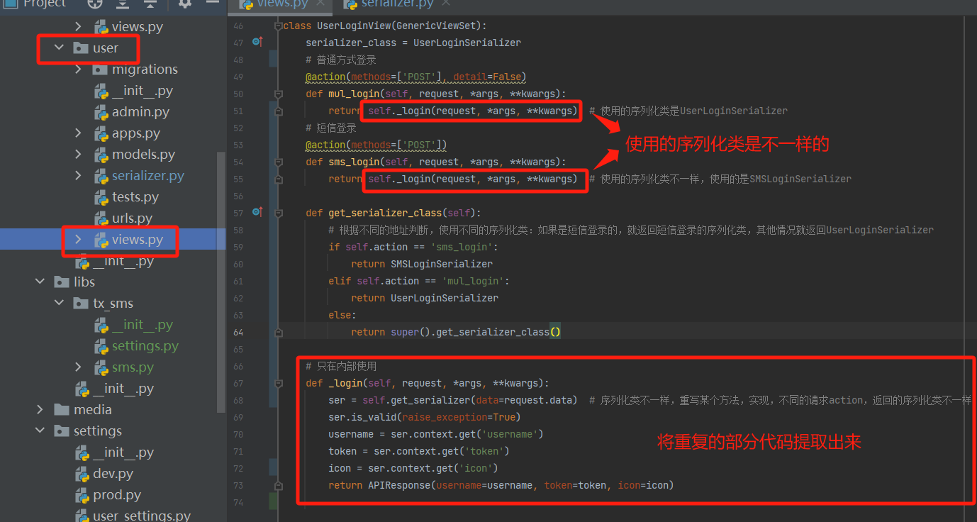 from django.utils.datastructures import MultiValueDictKeyError from rest_framework.viewsets import ViewSet from rest_framework.decorators import action from utils.common_response import APIResponse from .models import User from .serializer import UserLoginSerializer, SMSLoginSerializer from libs.tx_sms.sms import get_code, send_sms as send_sms_mobile # 防止和下面的send_sms方法冲突 from django.core.cache import cache from threading import Thread # 验证手机号是否存在接口 class MobileView(ViewSet): @action(methods=['GET'], detail=False) def check_mobile(self, request, *args, **kwargs): try: # 取出前端传入的手机哈 mobile = request.query_params['mobile'] User.objects.get(mobile=mobile) # 有且只有一个才不报错,否则报错 except MultiValueDictKeyError as e: raise Exception('您没有携带手机号') except Exception as e: raise Exception('未知错误,请联系管理员') return APIResponse(msg='手机号已存在') # 短信验证码接口 @action(methods=['POST'], detail=False) def send_sms(self, request, *args, **kwargs): # 1.手机号从前端传入:{mobile:1351150} mobile = request.data.get('mobile') # 2. 生成数字验证码 code = get_code() # 3. 将数字验证码保存,放到缓存中保存,默认放在内存里,下次使用时进行比较 cache.set('cache_mobile_%s' % mobile, code) # 4. 发送短信 ---》 同步操作 ----》前端可以会一直等待,耗时 # 5. 发送短信 ---》异步操作,使用多线程,无法知道短信是否成功了,不需要关注是否成功 t = Thread(target=send_sms_mobile, args=[code, mobile]) t.start() return APIResponse(msg='短信已发送')
