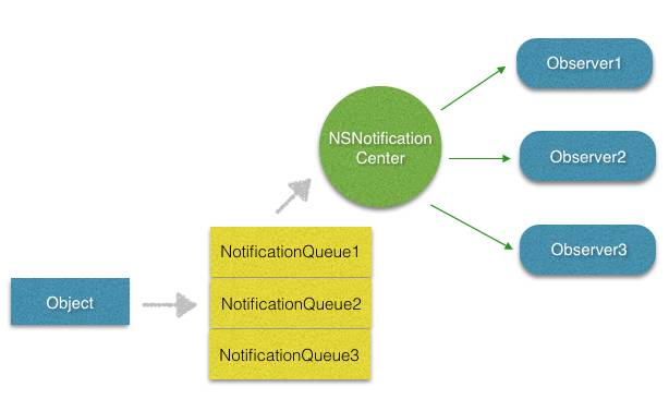 这些存储在通知队列中的通知会以先进先出的方法发出(FIFO),放一个通知到达队列的头部,它将被通知队列转发给通知中心,然后通知中心再分发给相应的监听者们。