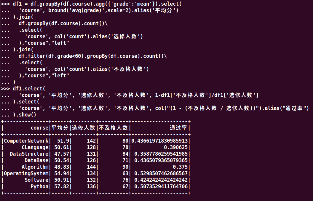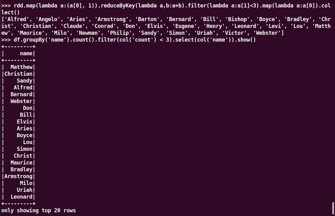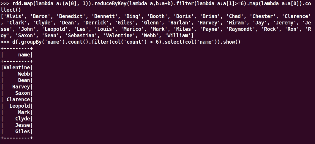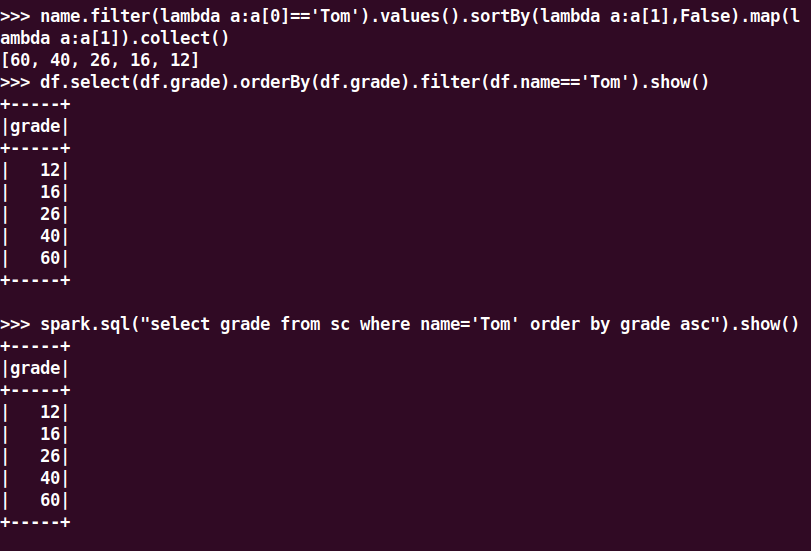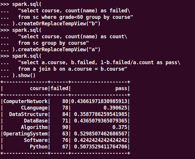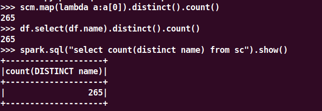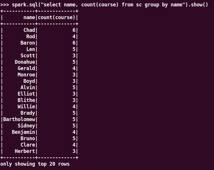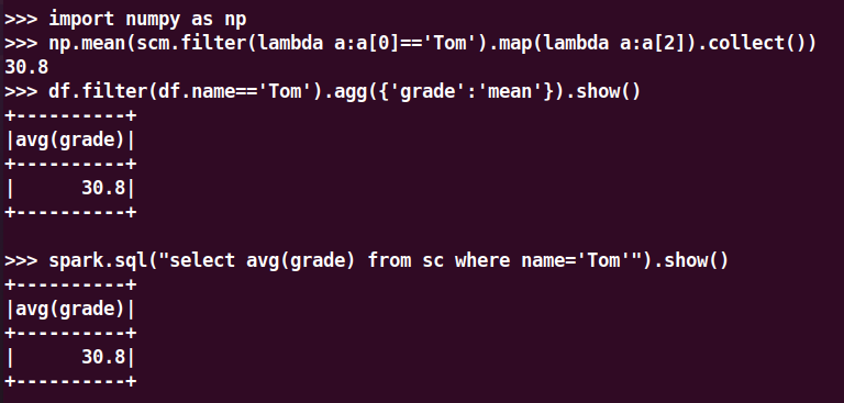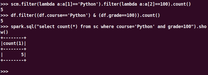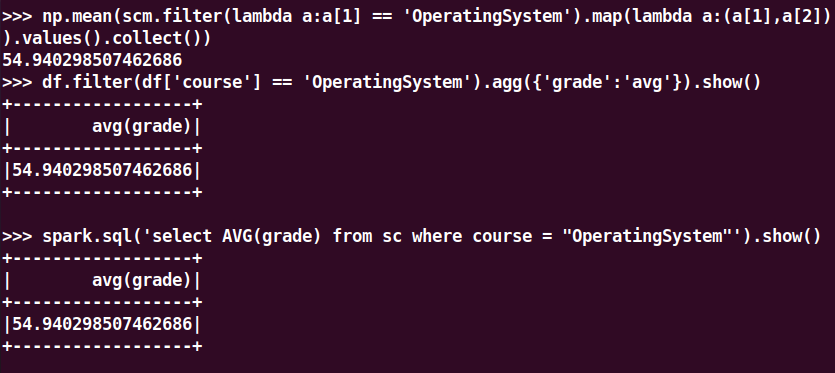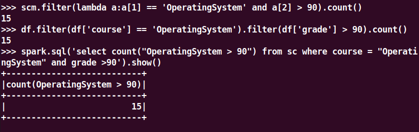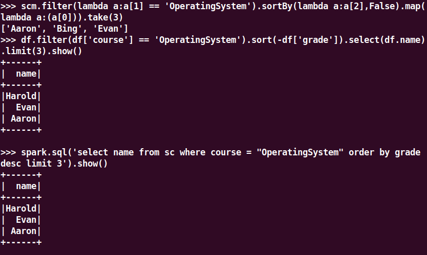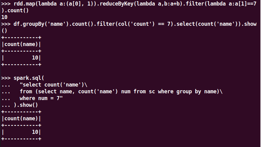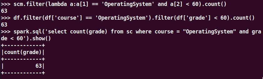 分别用RDD操作、DataFrame操作和spark.sql执行SQL语句实现以下数据分析: