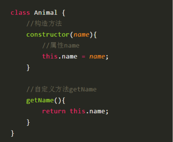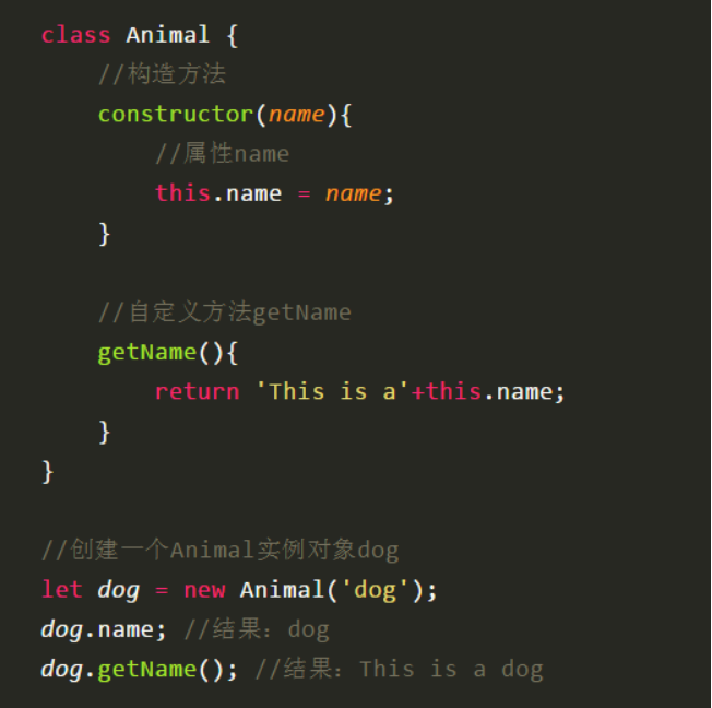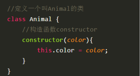 我们通过关键字class来声明一个名字叫Animal的类,可以看到类里面(花括号 {}里面)有一个叫constructor(构造、建造)方法,它就是构造方法,构造方法里面的this,指向的是该类实例化后的对象,这就是实现了一个类的声明。