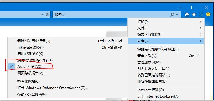 检查IE的安全设定,原来 "ActiveX筛选" 打勾了,这是银光插件被阻止的原因,取消 "ActiveX筛选" 就可以顺利登陆网站了。