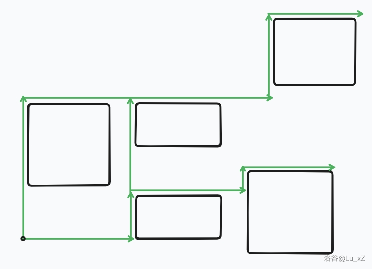 感性的理解一下为什么不重不漏,向下贴近不会改变路径与障碍的偏序关系,而向右贴近则使所有向上操作横坐标唯一确定。