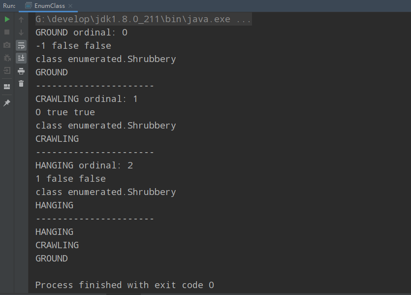 创建enum时,编译器会为你生成一个相关的类,这个类继承自java.lang.Enum。下面的例子演示了Enum提供的一些功能∶