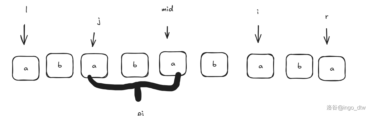 那么在上图,\(p_i=p_j\) 为什么呢?因为 \(s_{j\dots mid}=s_{mid\dots i}\) 这很明显吧,那么如果 \(j-p_j\ge l\) 也就是已 \(j\) 为回文中心的回文串在以 \(mid\) 为回文中心的回文串内,那么你发现 \(s_{j-p_j\dots j}=s_{i\dots i+p_j}\) 相等(因为他们在 \(s_{l\dots r}\) 这个回文串内,因为回文所以相等),所以 \(p_i\) 至少等于 \(p_j\)。 - 如果 \(i+p_j>r\):