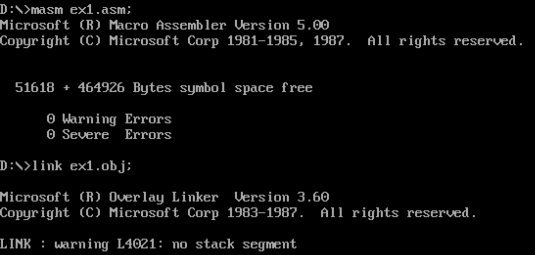 1 ;ex1.asm 2 assume cs:code 3 code segment 4 mov ax, 0b810h 5 mov ds, ax 6 7 mov byte ptr ds:[0], 1 8 mov byte ptr ds:[1], 1 9 mov byte ptr ds:[2], 2 10 mov byte ptr ds:[3], 2 11 mov byte ptr ds:[4], 3 12 mov byte ptr ds:[5], 3 13 mov byte ptr ds:[6], 4 14 mov byte ptr ds:[7], 4 15 16 mov ah, 4ch 17 int 21h 18 code ends 19 end
