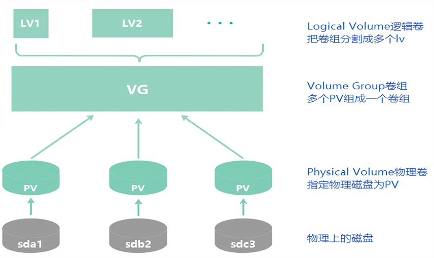注意:某逻辑卷空间不足,需要逻辑卷扩容,如果卷组有空间,则直接可以扩容,但如果卷组没有空间,其他磁盘还有空间,则可以分出一部分空间(创建分区),物理卷,加入到此逻辑卷的卷组中,即卷组扩容,再进行逻辑卷扩容