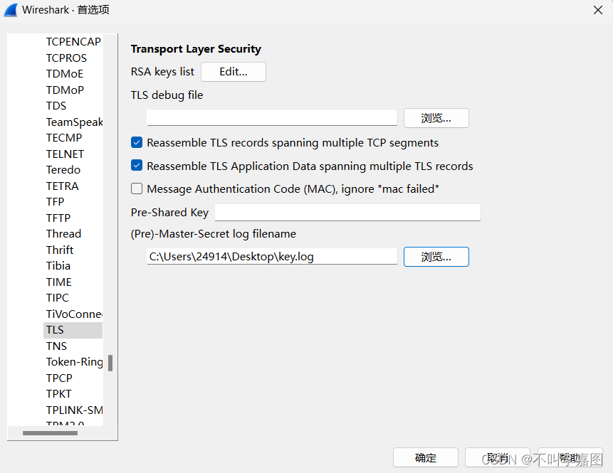 现在导入SSL密钥 :编辑->首选项->Protocols 如果看见SSL 选 TLS