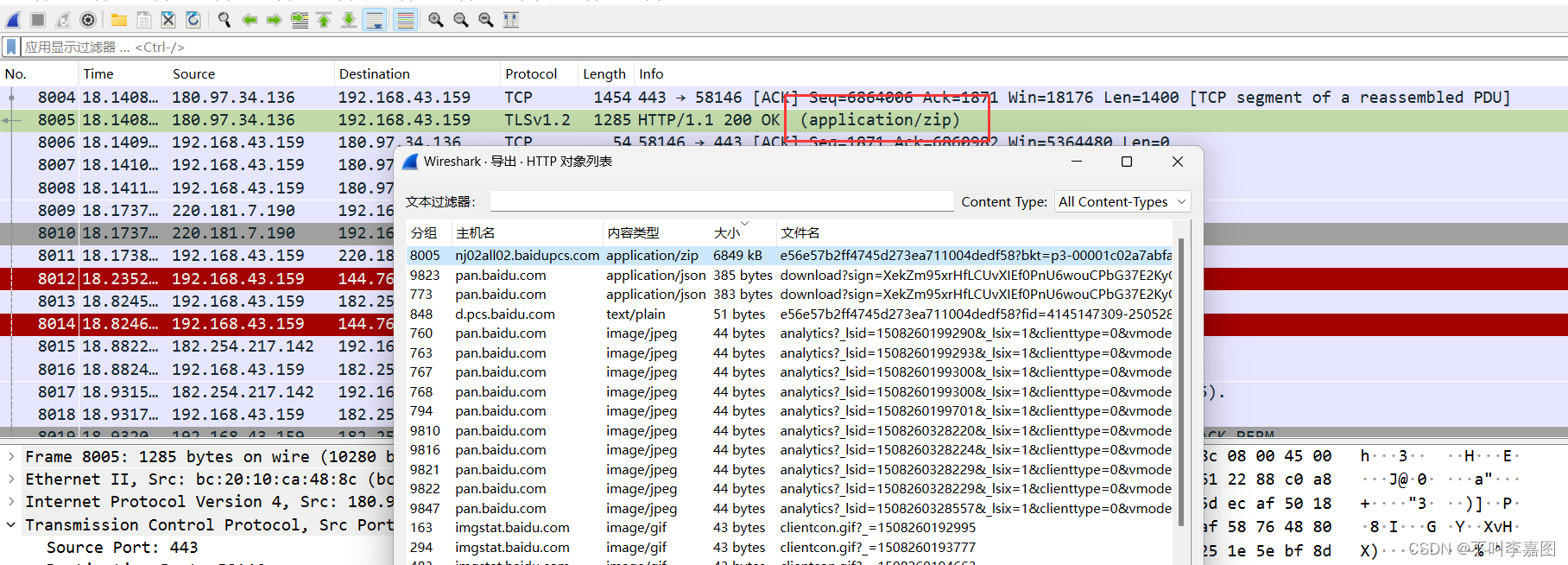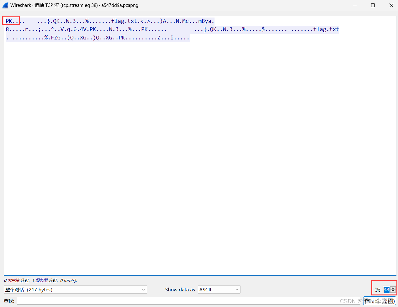 这个流量包有点 大 我们保存出来看一下 这是一个压缩包 我们双击这条流量包 外面直接跳这条流量包来了