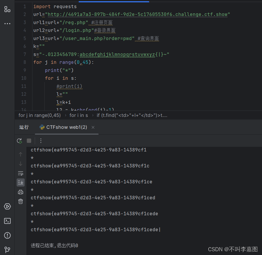需要花点时间 跑脚本 flag 一个一个字符出来了