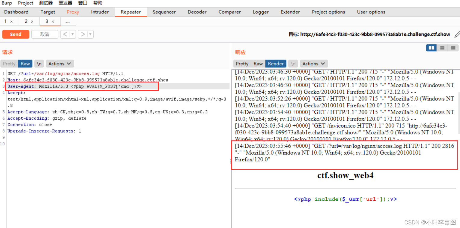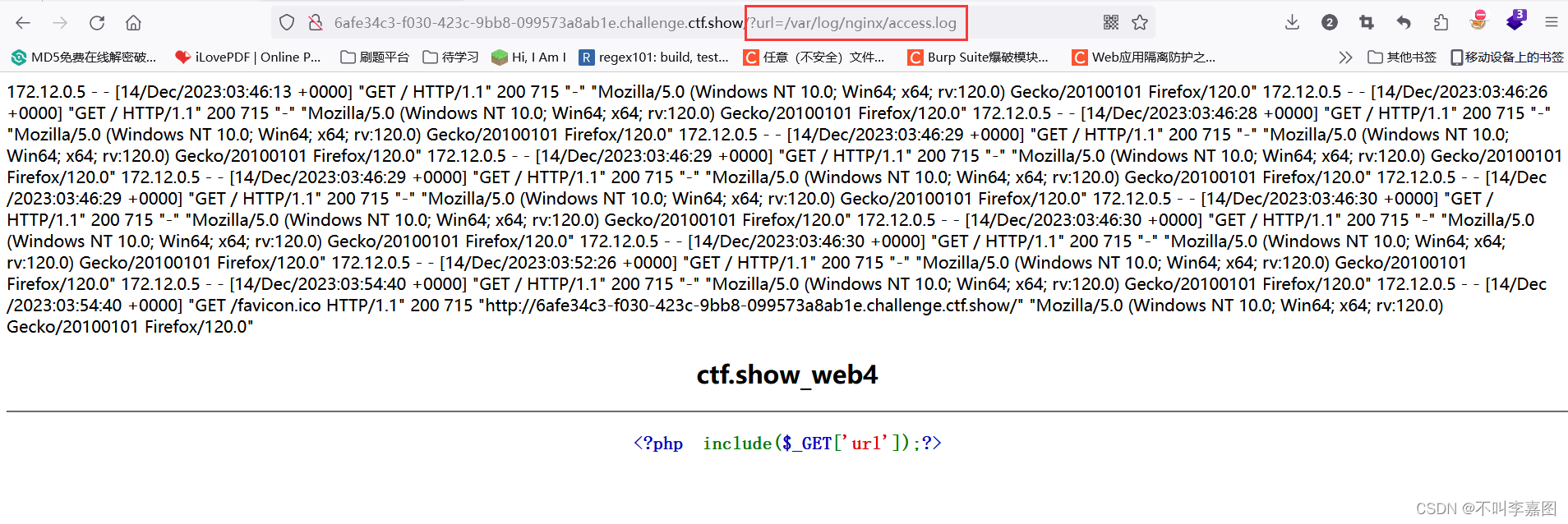 这里虽然有include函数 但是伪协议 用不了 需要我们通过日志注入进行任意命令执行得到getshell