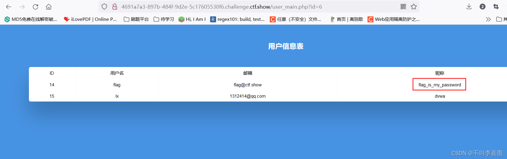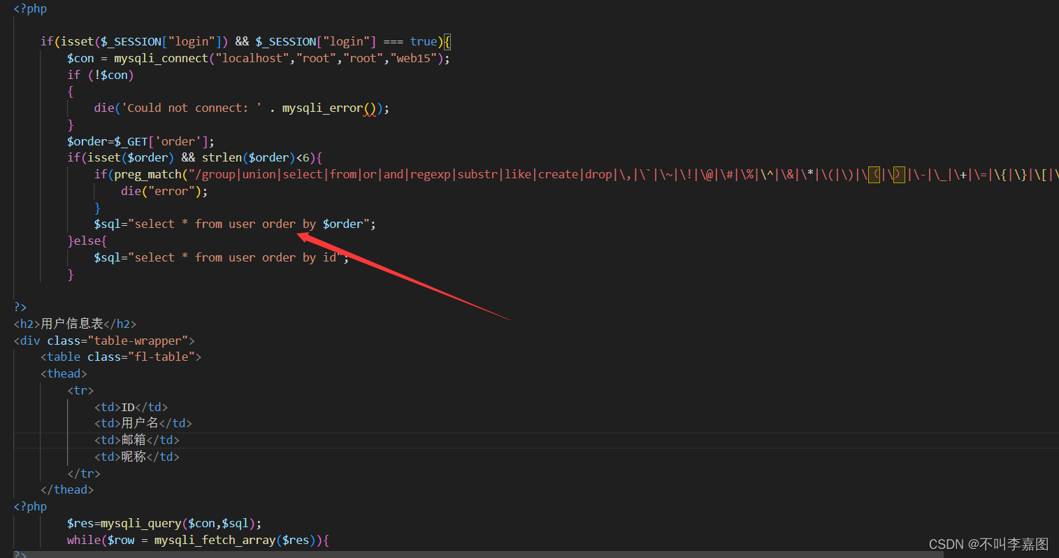 我们可以利用 $order=pwd即 select * from user order by pwd 来判断注册的密码与flag用户密码的大小 比如flag用户名的密码为 flag(abcd) 时 我们从小到大 f都在第一位 当我们注册密码为g时在第一位的下面
